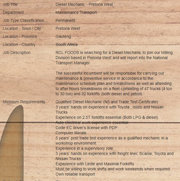 The Careers Portal On Twitter Vacancy Diesel Mechanic Company Rcl Foods Location Pretoria West Closing 4 June Jobseekerswednesday Jobseekerssa Apply Here Https T Co J4w1a3vwuh Https T Co Pawosrslaa Twitter